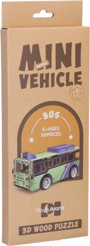 3D dřevěné puzzle Autobus se 30 dílky, rozměry 14x5,4x5,8 cm, pohyb na zpětné natažení. Perfektní pro děti od 6 let.