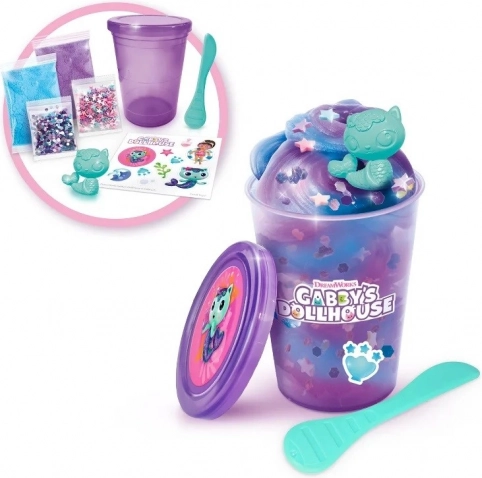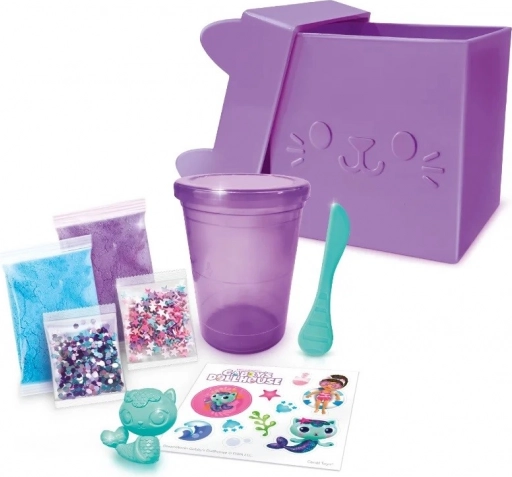Tento fialový sliz v tematické kočičí krabičce, inspirované oblíbeným seriálem KOCÍ DOMEK GABI, přináší hodiny tvořivé zábavy. Děti mohou sliz připravovat, zdobit, mačkat a natahovat – přesně tak, jak je to baví.
