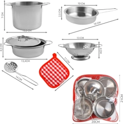 Tento realistický kovový set hrnců a náčiní je ideální pro dětské kuchyňky a hraní na domácnost, bistro nebo restauraci. Klasický stříbrný vzhled skvěle ladí s každým dětským koutkem a univerzální poklice pasuje na všechny hrnce. Díky lehké konstrukci a kompaktním rozměrům se celý set snadno přenáší a uklízí.