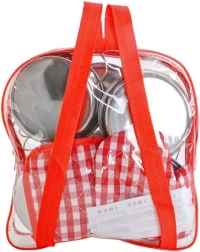 - 13 dílů – 2 hrnce (malý/velký), pánev, cedník, poklice, 6 kusů náčiní, textilní podložka a chňapka, průhledný batůžek.