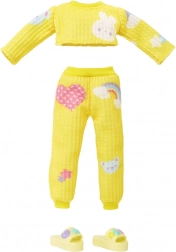Dvoudílné žluté pyžamo s hravými motivy, sladěné botky a výrazné mašličky ve vlasech podtrhnou osobitý styl panenky.