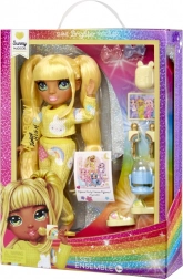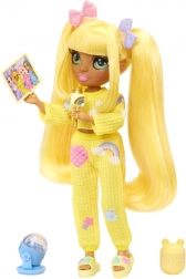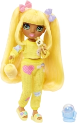 Sunny je připravena na nezapomenutelnou pyžamovou párty! Má dvoudílné žluté pyžamo se srdíčky a duhou, sladěné žluté bačkůrky a dlouhé rovné vlasy svázané do dvou culíků s mašličkami. Velké skleněné oči a dlouhé řasy dodávají panence jedinečný výraz, který si děti zamilují.