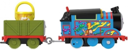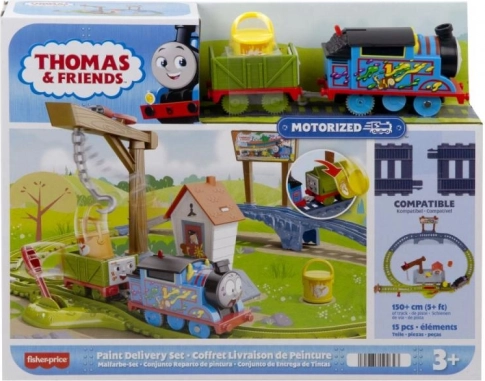 Sada doručení barvy přináší dětem oblíbený svět THOMAS & FRIENDS přímo do pokojíčku. Stačí posunout přepínač na střeše mašinky a Thomas se sám rozjede po trati. Na mostě dojde k zábavné akci – plechovky s „barvou“ v zlobivém vagónku se zhoupnou a mohou vypadnout, takže je potřeba je znovu naložit jeřábem.