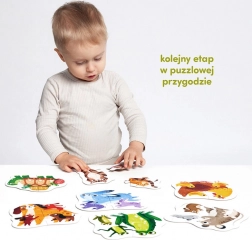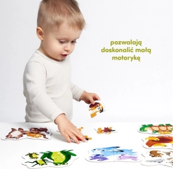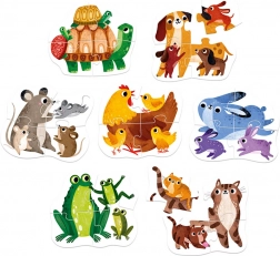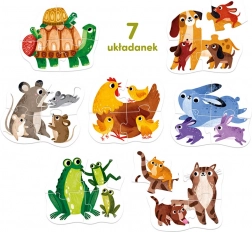 Objevte kouzlo prvních skládaček: barevné ilustrace s maminkami a mláďátky (kočka, králík, pes, slepice, želva, myš a žába) motivují děti k učení a hře. Díky přehledným tvarům a různobarevným rubům se dílky snadno párují a podporují prostorovou představivost a samostatnost.