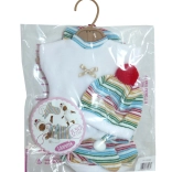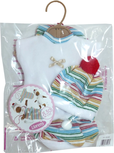Stylový 3dílný obleček pro panenku miminko Llorens velikosti 30 cm potěší kvalitou i detaily. Součástí je praktický přenosný vak na suchý zip, vše vyrobené ručně ve Španělsku. Ideální doplněk pro rozvoj fantazie a péče o panenky. Ruční výroba ve Španělsku, 3dílná sada, vak na suchý zip, pro panenky 30 cm, od 3 let.