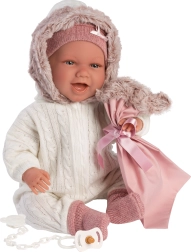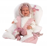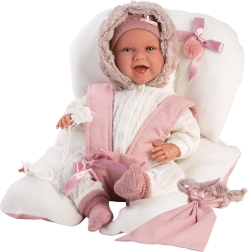 Tato elegantní sada rozšíří možnosti hry s panenkami NEW BORN o velikosti 40–42 cm. Obleček s jemnými ozdobami a praktická podložka s mašlí a popruhy umožňují pohodlné usazení panenky jako na židličce, což dětem přináší více zábavy i realismu při hraní.