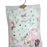 Praktický set obsahuje vše potřebné pro stylové oblékání panenky miminka o velikosti 38 cm. Skvělý základ dětského šatníku pro panenky.
