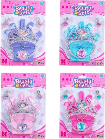 Kouzelná sada doplňků pro malé princezny obsahuje vše, co je potřeba k parádě: rukavičky, korunku (12,5 cm), čelenku, náhrdelník a náušnice. K dispozici jsou 4 barevné varianty – modrá, fialová, růžová a červená.