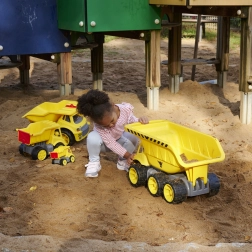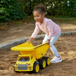 Šest velkých kol zajišťuje výbornou stabilitu v terénu i na podlaze. Nešpinící pneumatiky jsou šetrné k podlahovým krytinám a madlo umožňuje plynulé a bezpečné vyklápění nákladu. Hra se sklápěčkou rozvíjí hrubou motoriku, koordinační dovednosti a podporuje samostatnost i objevování.