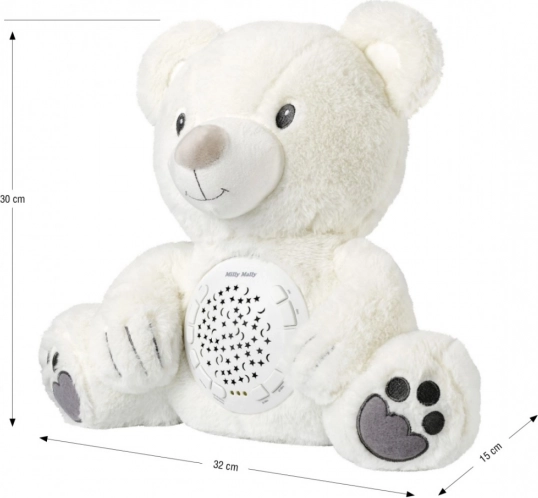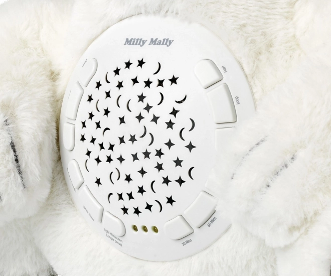 Plyšová hračka s projektorem Milly je dokonalým pomocníkem pro rodiče při uklidňování a uspávání kojenců. Po spuštění projektoru se vybírá náhodně z 10 ukolébavkových melodií, zatímco se promítá noční obloha.