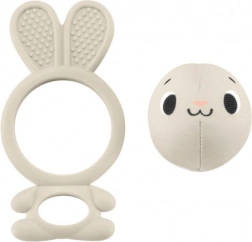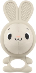 Silikonový králíček s texturovanými oušky a otvorem pro jistý úchop miminka. Odnímatelná zvonící kulička motivuje k pohybu a rozvíjí jemnou motoriku.