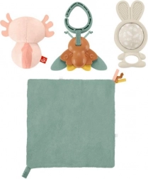 - 4 hračky: silikonové kousátko ve tvaru králíčka (bez BPA) s odnímatelnou zvonící kuličkou, plyšový axolotl se zvonkem, hmatová grzechotka‑motýl s klipem, měkký šustící panel se stužkou
