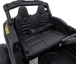 Měkké sedadlo z eko kůže s bezpečnostními pásy drží malého řidiče pevně na místě. Dálkový ovladač 2,4 GHz nabízí tři rychlosti a nouzové tlačítko Stop, takže máte jízdu vždy pod kontrolou.