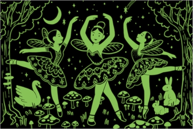 Poskládejte ohromující taneční scénu přímo z Labutího jezera s puzzle, které svítí ve tmě! Obsahuje 100 dílků s elegantními tanečnicemi, které se za tmy mění ve víly na kouzelném paloučku.