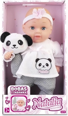 Roztomilé miminko NATALIA 33 cm s měkkým tělíčkem a hračkou. Ideální pro mazlení, hraní a rozvoj fantazie. Skvělá volba pro malé pečovatelky.
