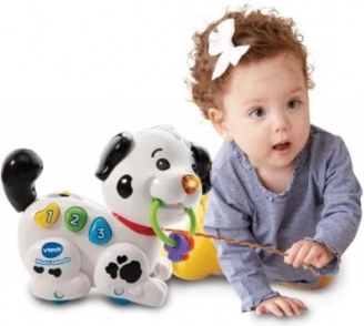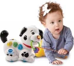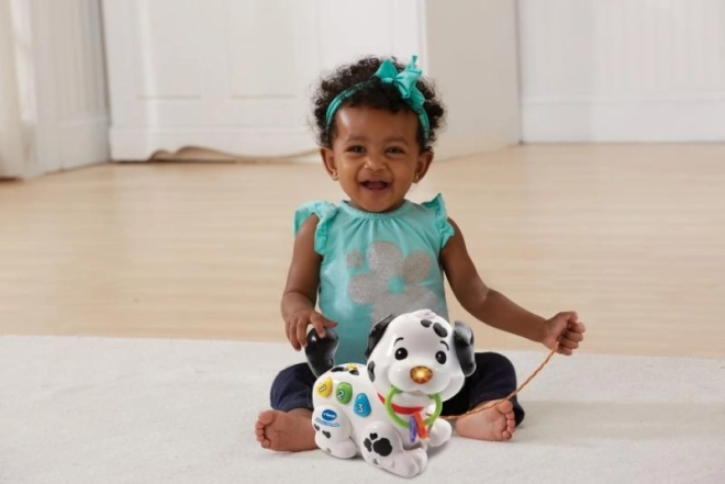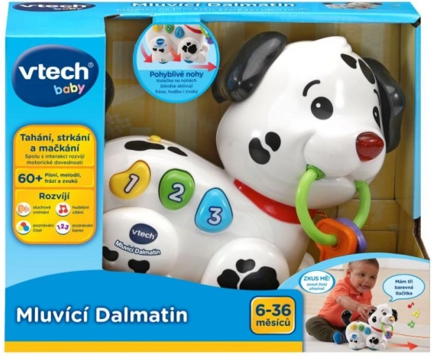 Roztomilý VTech mluvící dalmatin je interaktivní tahací pejsek, který děti od 6 měsíců učí první čísla a barvy. Po stisku barevných tlačítek přehrává melodie, písničky a české fráze, svítí a motivuje k pohybu pomocí tahací šňůrky. Součástí jsou testovací baterie 2× AAA.