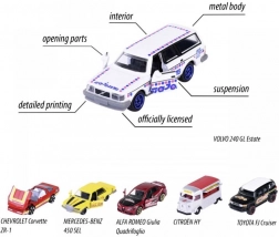 Každé autíčko je z kovu, má otevírací části (např. dveře, kapotu či kufr) a pružící podvozek pro zábavu i vystavení.
