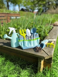 Lehká a přenosná taška nabízí dostatek prostoru, elastické úchyty pro nářadí a snadné přenášení. Sada je navržena na míru dětským rukám, takže práce na zahradě, u vyvýšených záhonů nebo na pískovišti je přirozená a zábavná. Odolné materiály zvládnou každodenní používání a rozmanité povrchy.