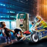 Akční sada PLAYMOBIL z řady City Action přináší napínavou honičku ve městě: policista na motocyklu pronásleduje kapesního zloděje, který vykradl bankomat. V balení najdete 2 figurky, motocykl, bankomat, páčidlo, vak na lup a bankovky – vše pro realistické městské dobrodružství.