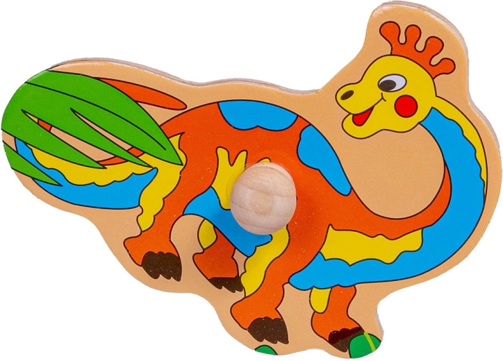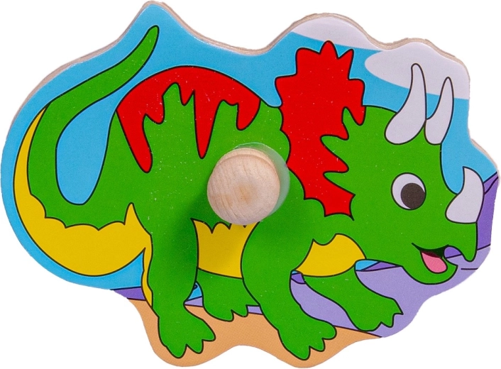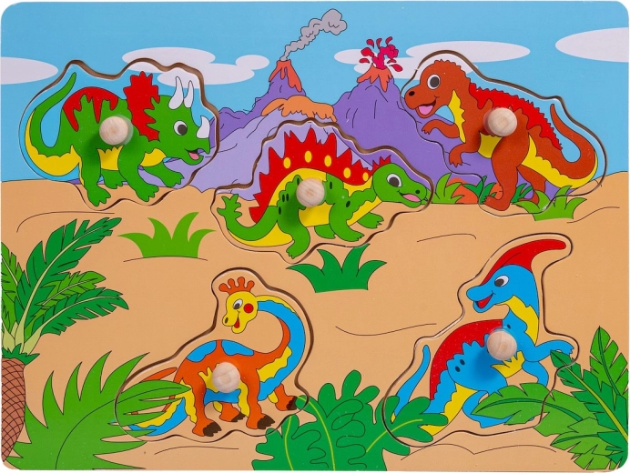 Dřevěná skládanka s motivem dinosaurů pro rozvoj dětské jemné motoriky a kognitivních dovedností. Obsahuje pestrobarevné dřevěné dílky s úchyty pro snadnou manipulaci.