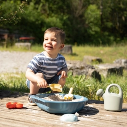 Písek a fantazie: Děti se mohou těšit na kreativní hru s konvičkou, hráběmi, lopatkou a dvěma formičkami. Je to perfektní způsob, jak se venku bavit, stavět hrad z písku nebo se jednoduše plácat v bahně.