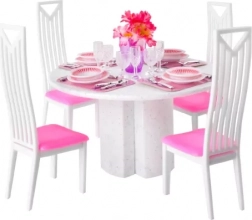 Tato promyšlená sada nábytku promění každý domeček pro panenky v útulnou jídelnu. Díky realistickým detailům – od růžových podložek přes talíře a příbory až po skleničky – si děti užijí dlouhé hodiny fantazijní hry a stolování s panenkami.