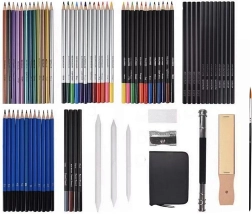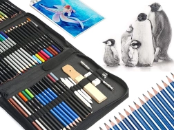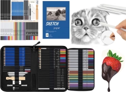 Sada obsahuje tužky různých tvrdostí, pastely, uhlíky, blendry, ořezávátko a skicák, což je vše, co potřebujete pro kompletní uměleckou tvorbu.