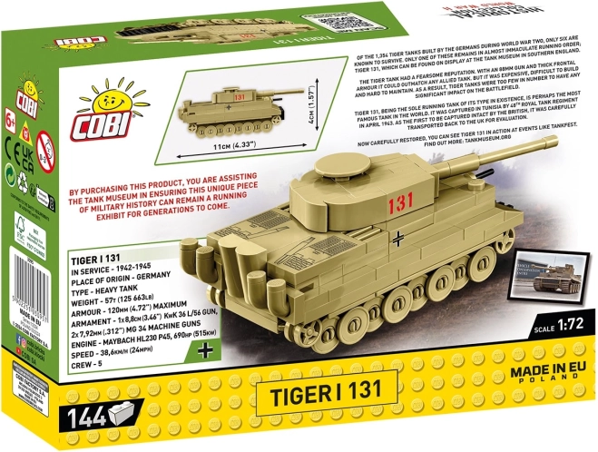 Model z konstručních kostiček COBI představuje tank Tiger I 131, jediný zachovaný fungující model svého druhu z druhé světové války. Tento historický klenot, který je k vidění v The Tank Museum v Bovingtonu ve Velké Británii, je skutečnou hvězdou mezi tanky. Tiger 131, vyrobený v roce 1942, byl zajat britskými silami v Tunisku v květnu 1943 a stal se součástí muzejní expozice po důkladné konzervaci.