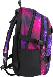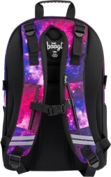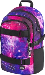 Stylový školní set BAAGL Skate Galaxy v kosmickém designu potěší každého školáka. Obsahuje lehký ergonomický batoh s objemem 25 l a kapsou na 15" notebook, pevný penál bez náplně a praktický sáček na přezůvky. Batoh má ergonomicky tvarovaná záda, nastavitelné popruhy včetně prsního, popruhy na skateboard, reflexní prvky a je z voděodolného materiálu. Celý set vyniká lehkou konstrukcí (850 g) a promyšlenou organizací pro pohodlné každodenní nošení.
