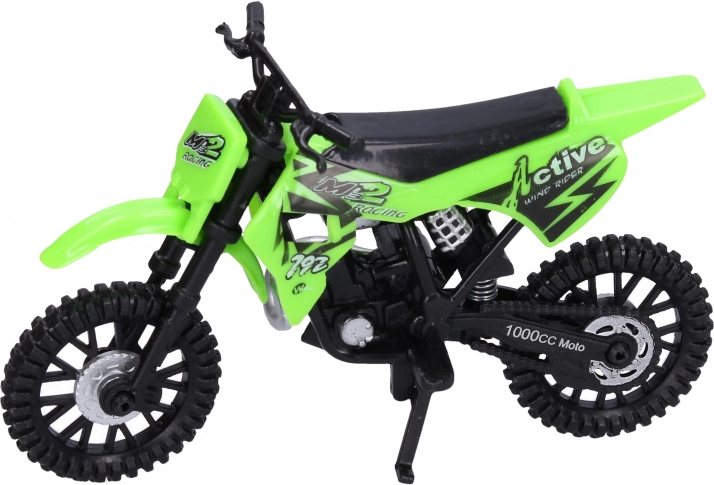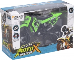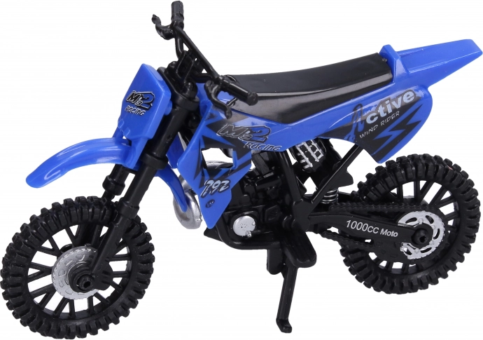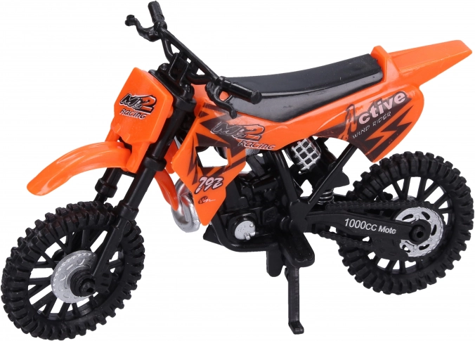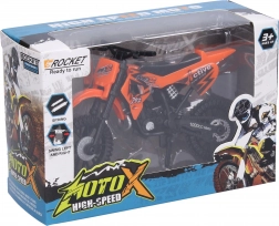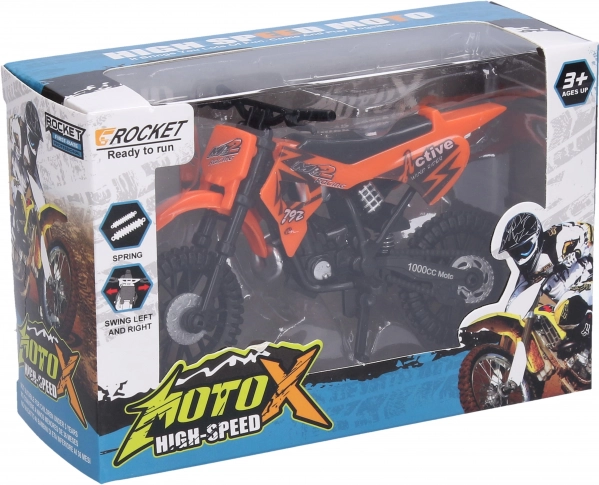 Kompaktní terénní motorka o velikosti 12 cm potěší malé závodníky svým realistickým vzhledem a snadným ovládáním. Má volně běžící kola, je dostupná ve 3 barevných variantách (oranžová, zelená, modrá) a skvěle se hodí pro hraní doma i na cestách.