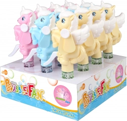 Zábavný bublifuk s ventilátorem ve tvaru jednorožce potěší děti i dospělé. Obsahuje 30 ml náplně, má praktický ventilátor pro snadné tvoření bublinek a kompaktní rozměry 11 × 5 × 21,5 cm – ideální na výlety, oslavy i hřiště. K dispozici ve třech barevných variantách.