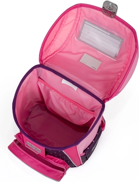 Hlavní komora s vnitřní kapsou, jmenovkou a rozvrhem hodin umožňuje efektivní organizaci školních pomůcek. Přední a boční kapsy poskytují prostor pro svačinový box a další doplňky.
