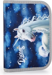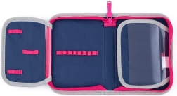 Penál: Jednopatrový se dvěma chlopněmi bez náplně, s gumovými poutky na psací potřeby a průhlednou fólií pro rozvrh hodin na vnitřní chlopni.