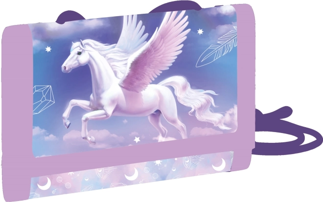 Tato dětská textilní peněženka s motivem pegas je navržena pro bezpečné uložení peněz i drobností. Díky suchému zipu se snadno otevírá a zavírá, zatímco praktická šňůrka na krk udrží peněženku vždy po ruce. Kompaktní rozměry a nízká hmotnost jsou ideální pro malé ruce i každodenní používání.
