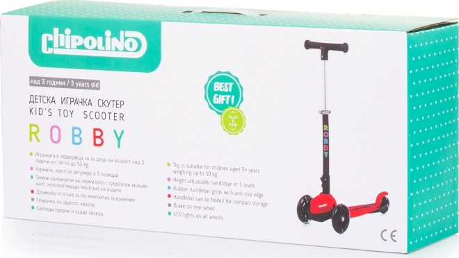 Koloběžka Robby se vyznačuje lehkým hliníkovým rámem, který zaručuje snadnou manipulaci. Je vhodná pro děti od 3 let a má nosnost až 50 kg. Díky gumovým protiskluzovým rukojetím a širokému stupátku poskytuje větší bezpečnost a komfort při jízdě. Koloběžka je vybavena předními i zadními kolečky s barevnými LED světly, které zajišťují viditelnost i v tma. Řídítka jsou nastavitelná do třech poloh a lze je složit pro snadné uložení. Pro zastavení slouží nášlapná brzda na zadním kole.