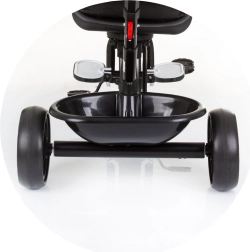 Bezpečnost je na prvním místě: tříkolka má odnímatelné ochranné madlo, bezpečnostní pásy a stabilní konstrukci. Rodiče ocení nastavitelnou rukojeť, skládací opěrky nohou a praktické koše na drobnosti vpředu i vzadu. Jakmile je dítě připravené, lze madlo i rukojeť se stříškou odejmout a malý jezdec může šlapat samostatně.
