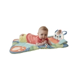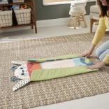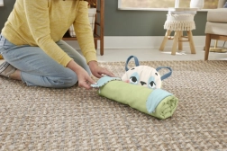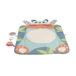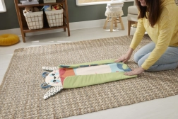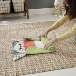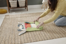 Podložka je vyrobena z látky obsahující 90 % recyklovaného plastu a dodává se v obalu s certifikací FSC. Díky chytrému řešení ji jednoduše srolujete, zajistíte „tlapkami“ a vezmete s sebou na cesty. Odnímatelné hračky snadno připnete na poutka, takže je hraní vždy nové a podnětné.