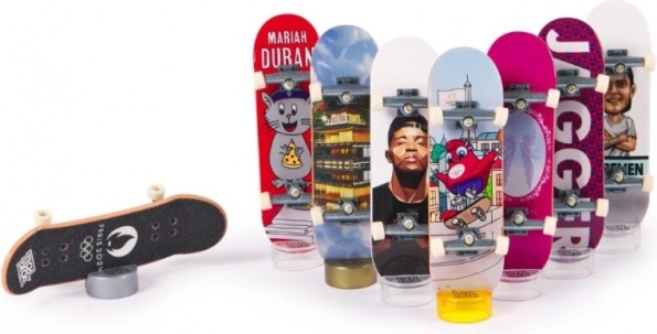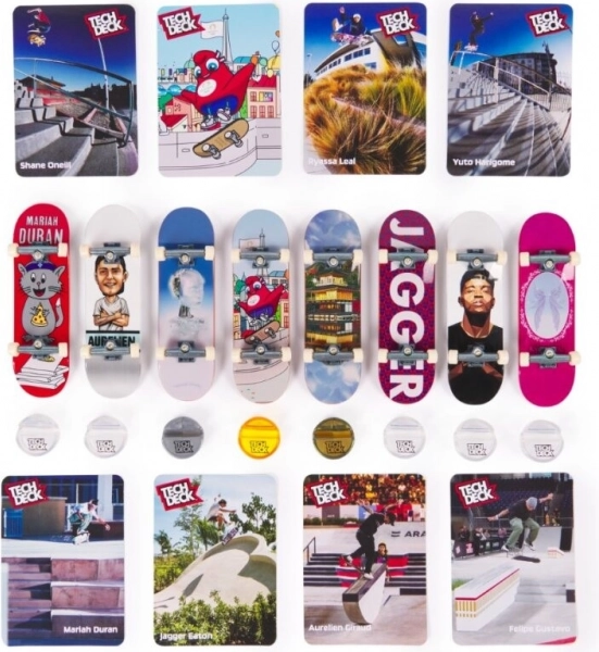 Každý fingerboard v této kolekci má autentický design od světově známých skatových firem. Součástí je také 8 sběratelských karet, které zobrazují vybrané skateboardisty při akrobatických kouscích. Postavte své fingerboardy na stojany se zlatými, stříbrnými a bronzovými držáky a vystavte své skvosty s hrdostí.