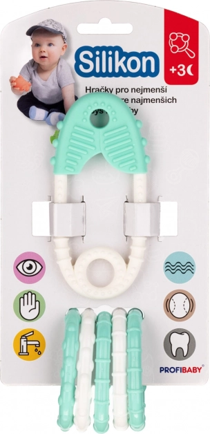 Silikonové kousátko Špendlík s přívěsky je navrženo pro jemné masírování dásní a zklidnění při prořezávání zoubků. Kombinace odolného plastu a měkkého silikonu zajišťuje příjemný dotek a bezpečné používání již od narození.