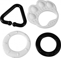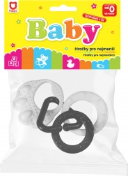 Černobílé kontrastní kousátko ve tvaru medvědí tlapky se zavěšenými plastovými tvary (kolečko, srdíčko, zvoneček) stimuluje zrak novorozenců, podporuje rozvoj smyslů a přináší zábavu při kousání.