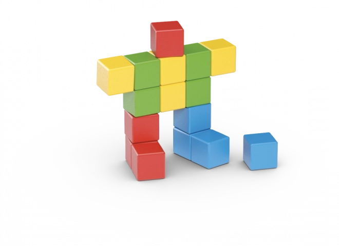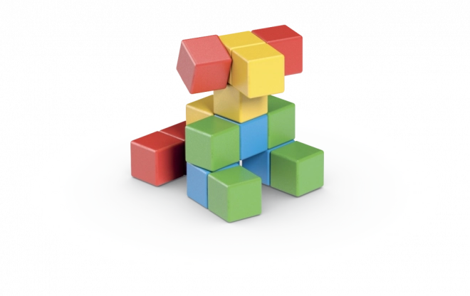 Z 16 kostek složíte jednoduché postavičky, zvířátka i fantastické tvary. Hra přirozeně rozvíjí představivost a logické myšlení.