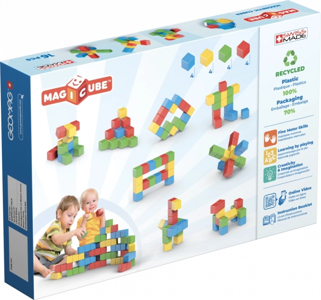 Stavění je bezpečné, zábavné a bez obrazovek. Kostky jsou odolné, příjemné do ruky a díky magnetům drží pevně pohromadě. Sada 16 dílků je skvělým startem do světa magnetických stavebnic a lze ji snadno rozšiřovat o další sety GEOMAG.