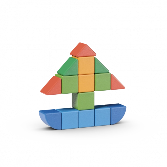 Velké, barevné dílky se zaoblenými hranami jsou navrženy pro malé ruce. Podporují jemnou motoriku, koordinaci oko–ruka i rozvoj fantazie.