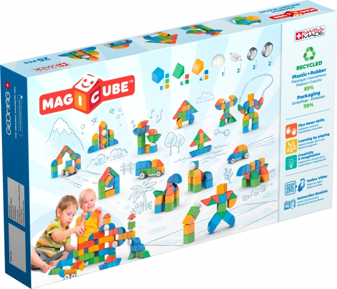 GEOMAG MAGICUBE SHAPES přináší dětem od 1 roku chytrou zábavu s magnetickými kostkami a tvary, které se k sobě snadno a bezpečně přichytávají. Sada obsahuje 25 dílků včetně koleček, takže malí stavitelé mohou vytvářet nejen věže a domečky, ale i jednoduchá vozítka a pohyblivé modely. Barevné provedení podporuje rozpoznávání barev a tvarů, jemnou motoriku i prostorovou představivost.