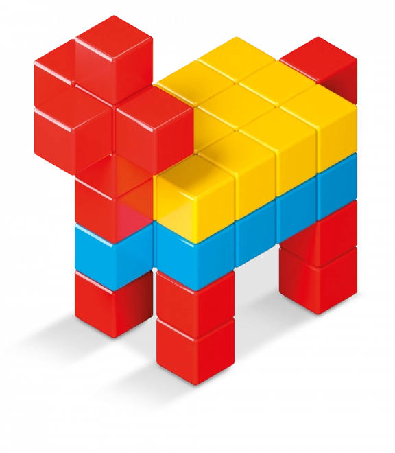 Děti snadno vytvářejí postavičky, zvířata i dopravní prostředky. Barevné kostky podporují představivost a rozvoj jemné motoriky.