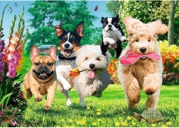 Objevte krásně zpracované puzzle z kolekce Tea Time, které vás vtáhne do světa barev, emocí a radostné energie. Vividní motiv se psy v rozkvetlé zahradě vyniká detailní ilustrací a sytými barvami, díky nimž je skládání skutečným požitkem. Hotové puzzle o rozměru cca 68,3 × 48 cm se skvěle hodí i k zarámování.