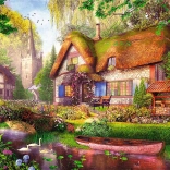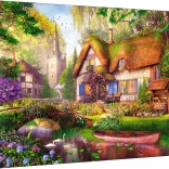 Ilustrace útulné chalupy u jezírka plná barev a detailů potěší milovníky malebných krajin a klidných chvil u puzzle.