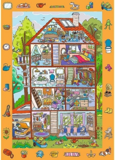 Puzzle s motivem „V domě“ přináší jedinečnou kombinaci skládání a hry na hledání. Děti si nejprve poskládají velký, barevný obrázek a poté v něm pátrají po skrytých prvcích, které jsou zobrazeny po stranách rámečku. Zábava tak nekončí vložením posledního dílku.
