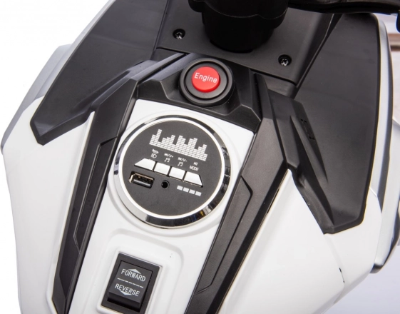 Velká plastová kola s gumovým běhounem zvyšují komfort a přilnavost, zatímco LED přední světla zlepšují viditelnost. Palubní panel s připojením MP3, AUX, USB a Bluetooth umožní přehrávání oblíbené hudby. Pohodlné sedlo a ergonomie jsou uzpůsobeny dětem pro pohodlné ovládání.