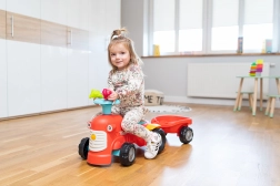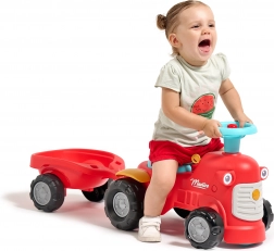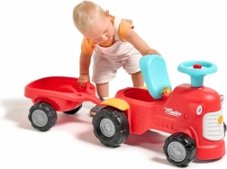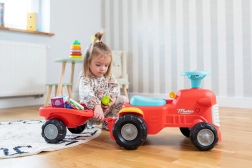 Toto červené dětské odrážedlo ve tvaru traktoru s odnímatelným přívěsem je ideální první vozítko pro batolata. Díky stabilní konstrukci a maximální nosnosti 25 kg je jízda bezpečná a pohodlná. Otočná přední náprava usnadňuje zatáčení, zatímco houkačka v řídítkách přidává porci zábavy během každé vyjížďky.